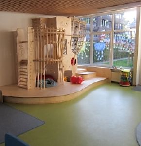 Jede unserer insgesamt drei Gruppen verfügt über einen Gruppenraum mit einer intergrierten Podestlandshaft zum klettern, spielen und verstecken.