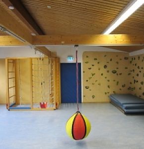 In der oberen Etage befindet sich eine Turnhalle mit vielen verschiedenen Bewegungsmöglichkeiten. Eine Kletterwand zur Förderung der Geschicklichkeit, eine Balkenanlage mit verschiedenen Einsatzmöglichkeiten wie Schaukeln, großes Kletternetz, Balancierkreisel und vieles mehr.