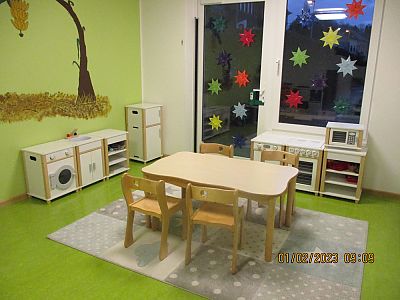 Eine Kinderküche läd zu selbständigen hauswirtschaftlichen Aktivitäten ein und der Mal-und Bastelbereich zur kreativen Entfaltung.