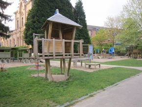 Das großzügige Außengelände mit ihren vielen Kletter- und Balanciergelegenheiten bietet den Kindern abwechslungsreiche Bewegungsmöglichkeiten. Ihnen steht ein Baumhaus eine Wassermatschanlage, Wipptiere, eine Spieleisenbahn, zwei Kletterhäuser mit Rutschen und ein Kletter-und Turnturm zur Verfügung.