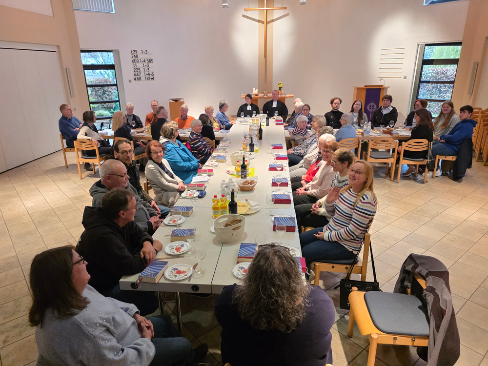 Wir haben den Gottesdienst an Tischen sitzend gefeiert. Das hat folgenden Hintergrund: Als Jesus und seine Jünger das erste Abendmahl feiern, sitzen sie zu Tisch. Hier spricht Jesus jene Worte, die seinen Tod am Kreuz deuten: